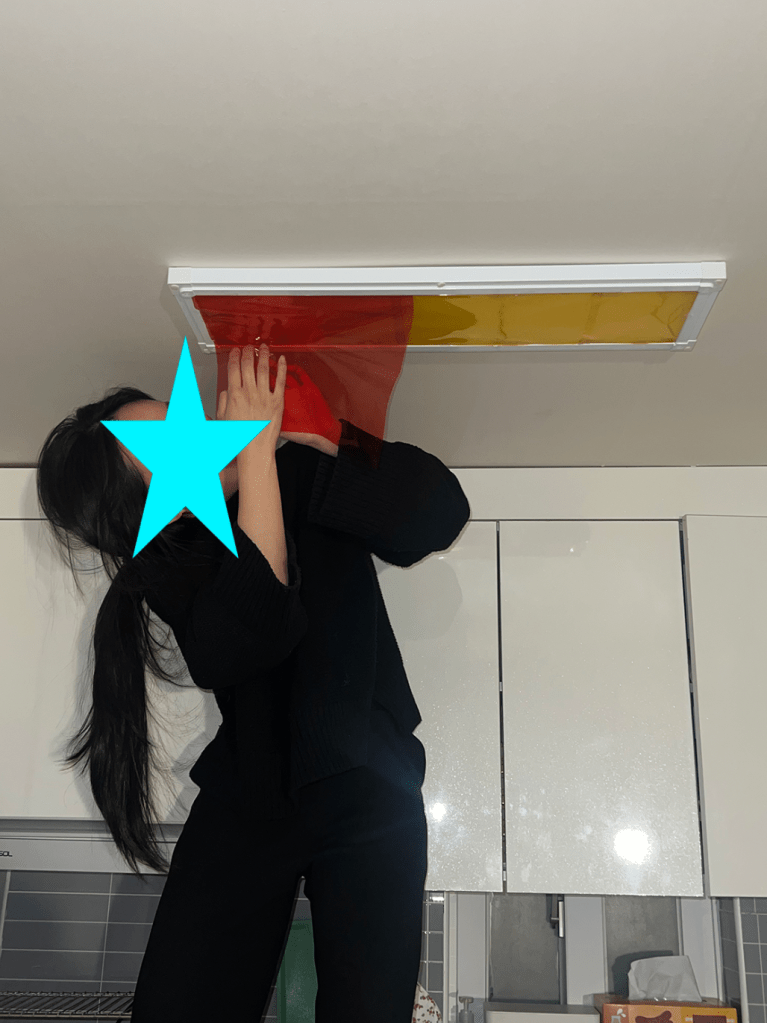 저는 주광색 빛을 싫어하다못해 눈마주치면 기절해버리는 사람인데요.. (응급실 체험 하는 느낌ㅠㅠ) 사진에 보이는 의문의 여성(장모씨)께서 저희집에 놀러와 셀로판지로 그 빛을 가려주고 가셨습니다. 섬섬옥수 섬세한 손길에 저는 내내 감탄을 멈출 수가 없었는데요, 그녀의 희생이 아마 일년은 두고두고 기억할 감동경험이라 마지막을 장식하게 되었습니다. 축하합니다!
